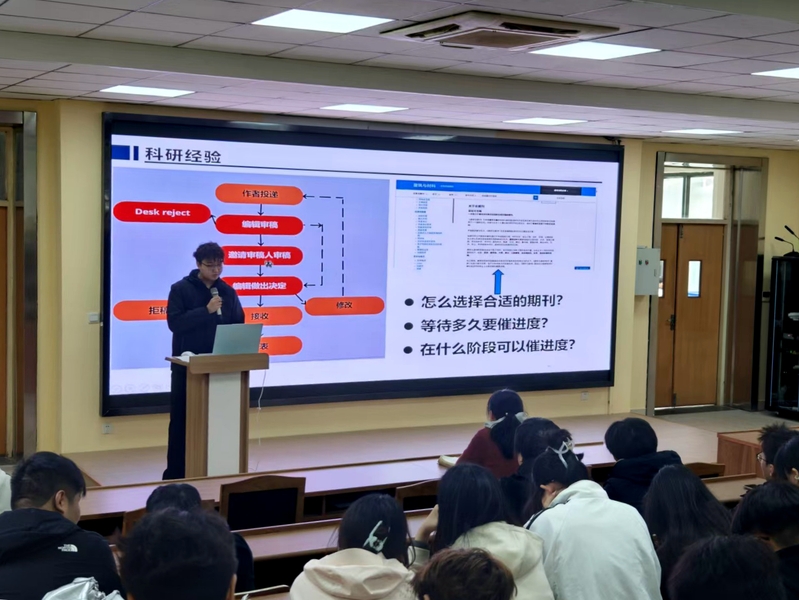 本次分享会分为科研经验分享与求职经验分享两大环节。国家奖学金获得者马浩哲、鲍溢依次登台,马浩哲聚焦科研开展与申博准备展开细致讲解,鲍溢则重点分享了科研论文写作技巧与考博实战经验,二人的干货分享为有志于科研深造的同学提供了实用思路。