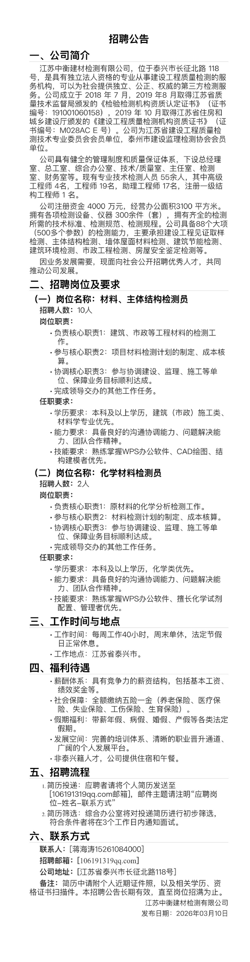 招聘速递[2026034]江苏中衡建材检测有限公司招聘